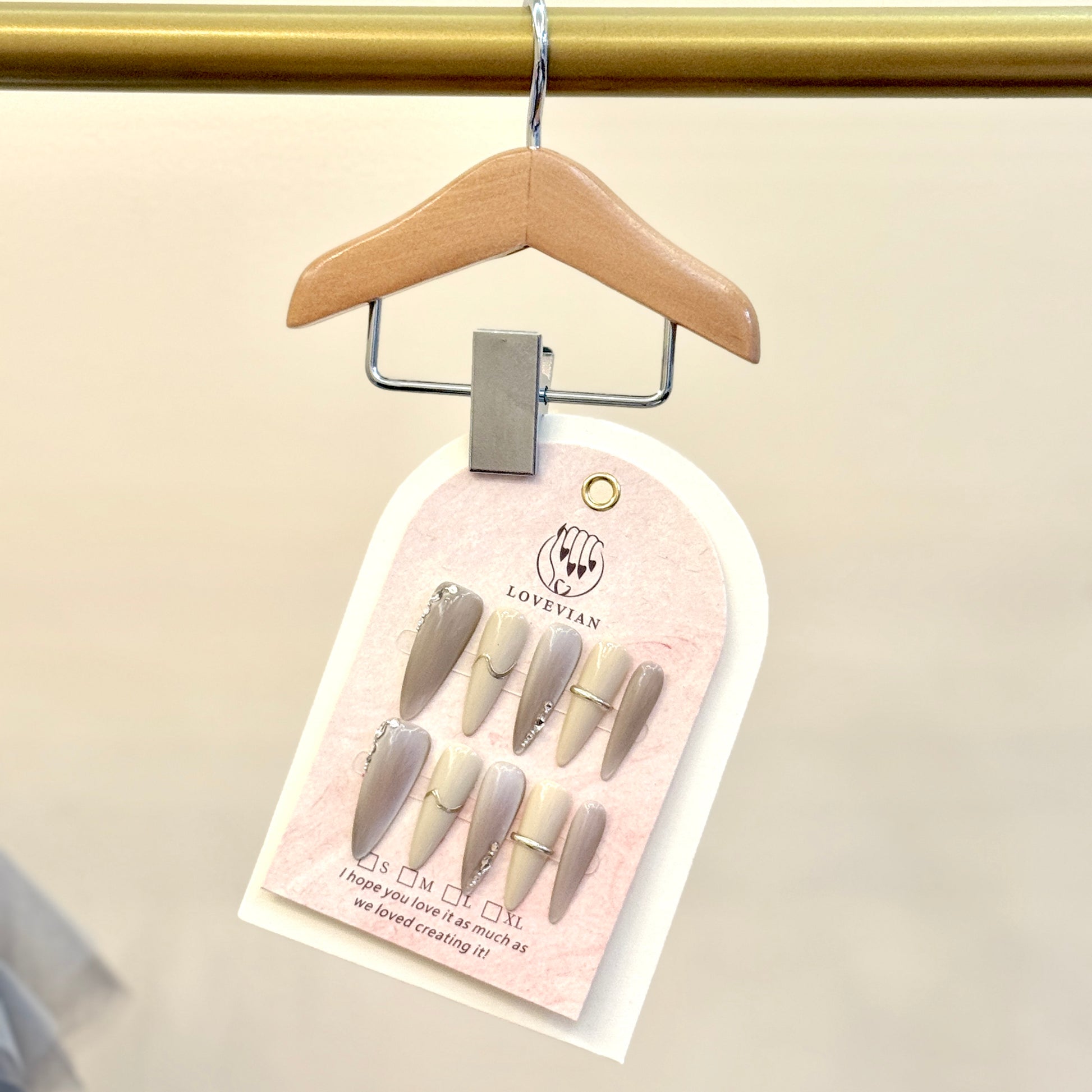 Embrace understated elegance with *Champagne Moonlight*, a silver and nude luxury press-on nail set designed for the modern sophisticate. Featuring a luminous champagne silver shimmer, creamy nude polish, and delicate gold wave accents, this design is elevated with crystal details for a subtle sparkle. Perfect for wedding press-on nails, elegant evening manicures, or as a versatile high-end press-on nail set that transitions effortlessly from day to night. Each piece is handcrafted to deliver a salon-perfect, long-lasting manicure without the wait.