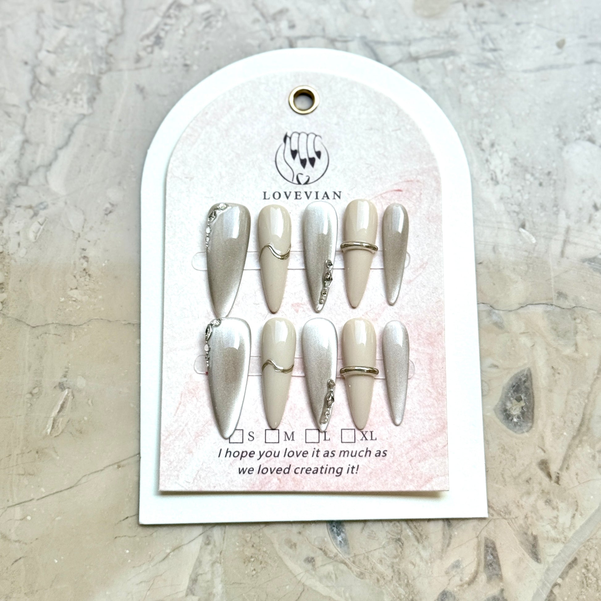 Champagne Moonlight – Silver & Nude Luxury Press-On Nails with Gold Wave and Crystal Accents