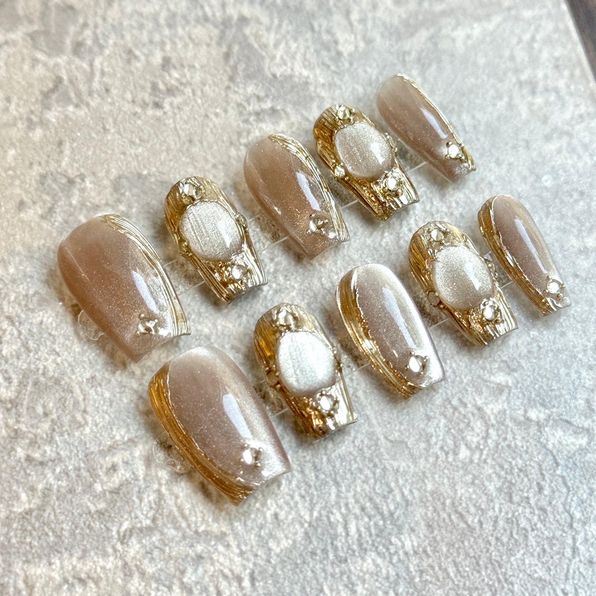 Discover timeless elegance with *Golden Pearl Mirage*, a champagne gold luxury press-on nail set adorned with gemstone-inspired cabochons and sparkling crystal accents. The metallic gold texture adds depth and dimension, while the pearl-like centerpiece captures light with every movement. Perfect for wedding press-on nails, evening gala manicures, and sophisticated high-end press-on nail lovers seeking a jewelry-inspired finish. Handcrafted with precision, this designer press-on nail set offers a long-lasting, salon-perfect look without the appointment.