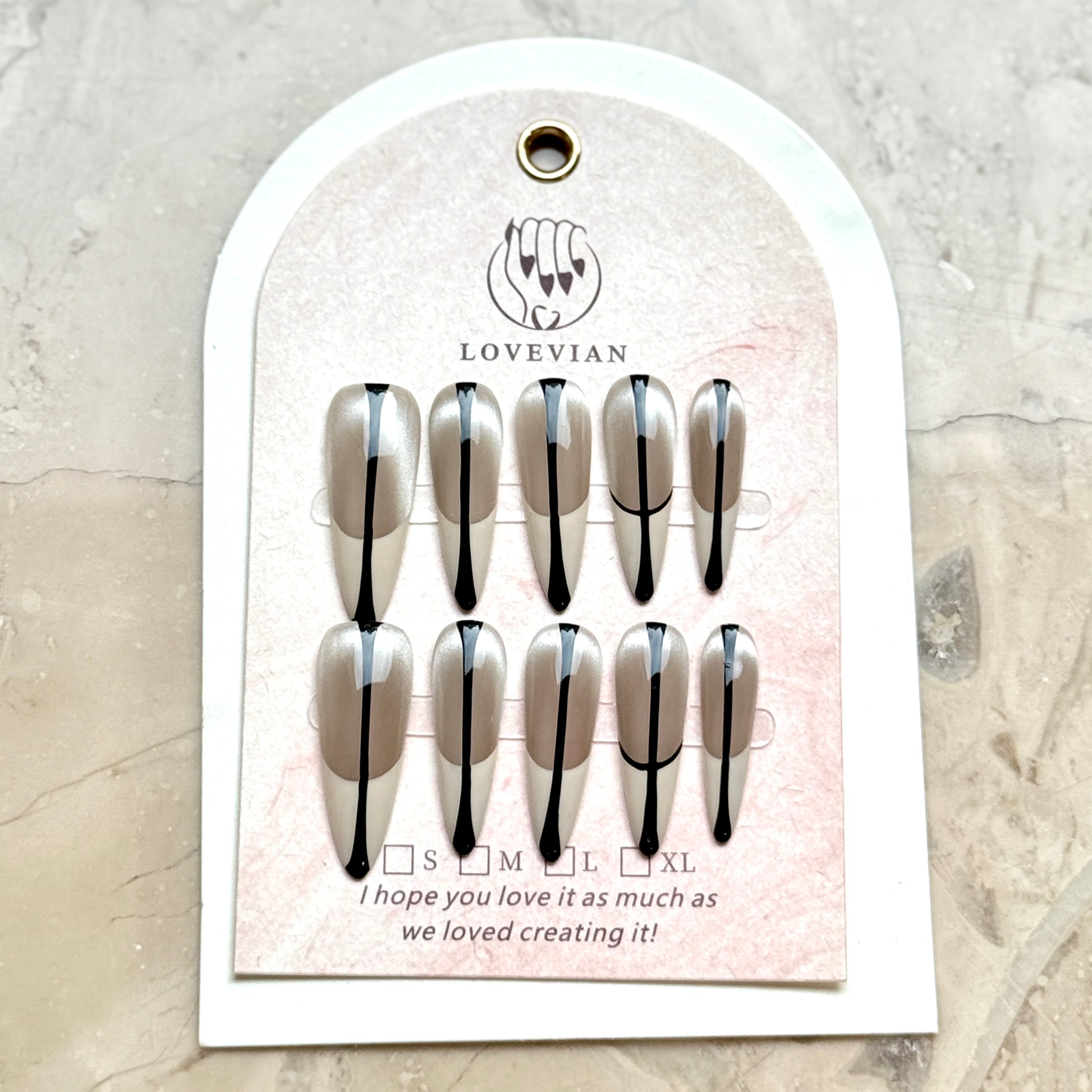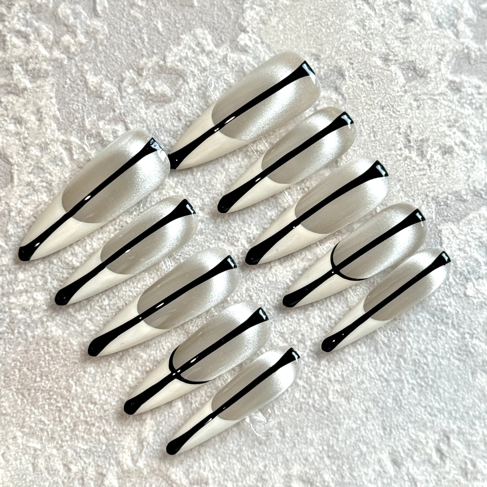 Make a bold minimalist statement with *Monochrome Edge*. This silver and white French press-on nail set is defined by a sleek black vertical line that elongates the nails and adds a modern edge. Perfect for high-fashion events, everyday chic manicures, and luxury press-on nail lovers who appreciate clean lines and a contemporary vibe. Handcrafted for a salon-quality finish, this designer press-on nail set ensures long-lasting wear without the wait.