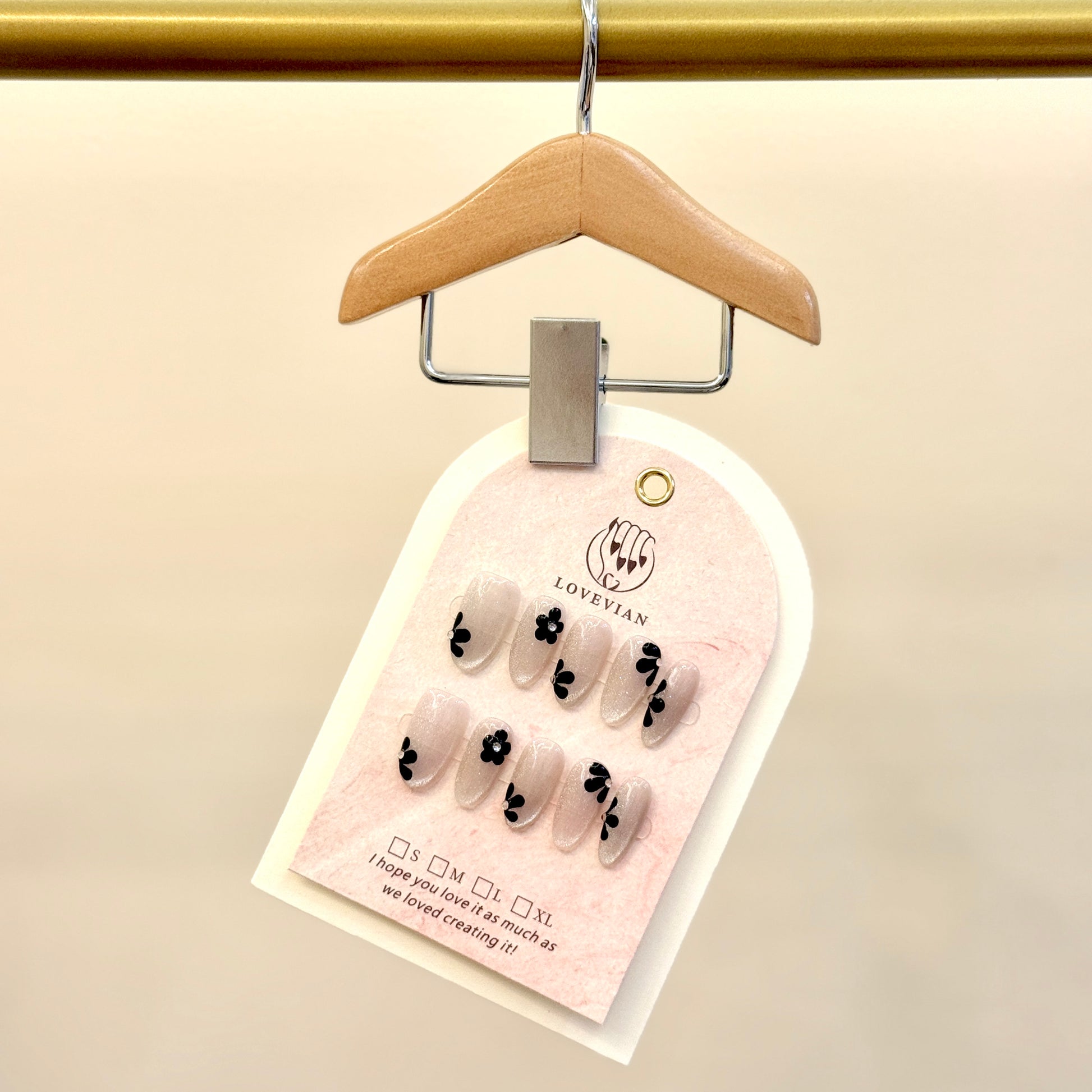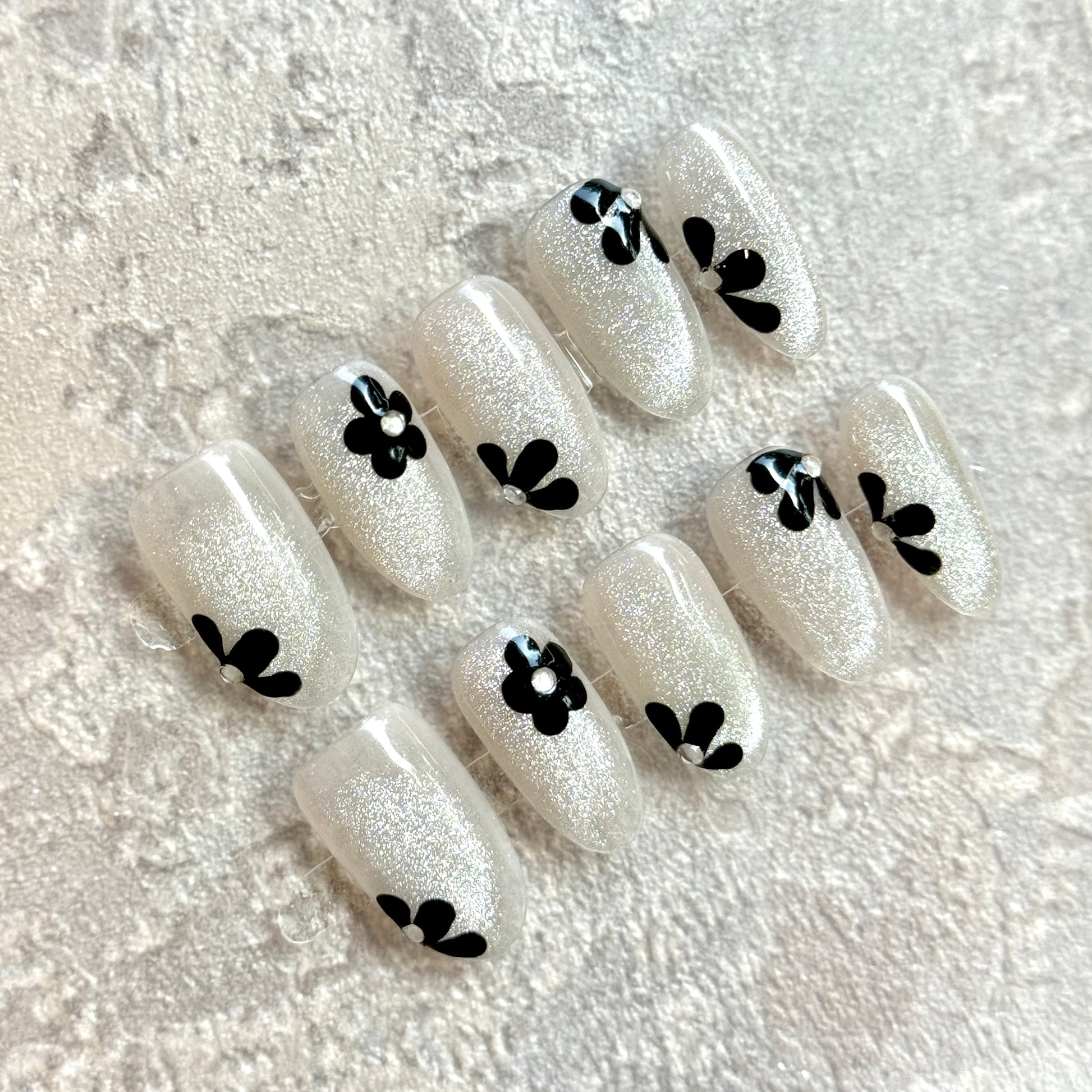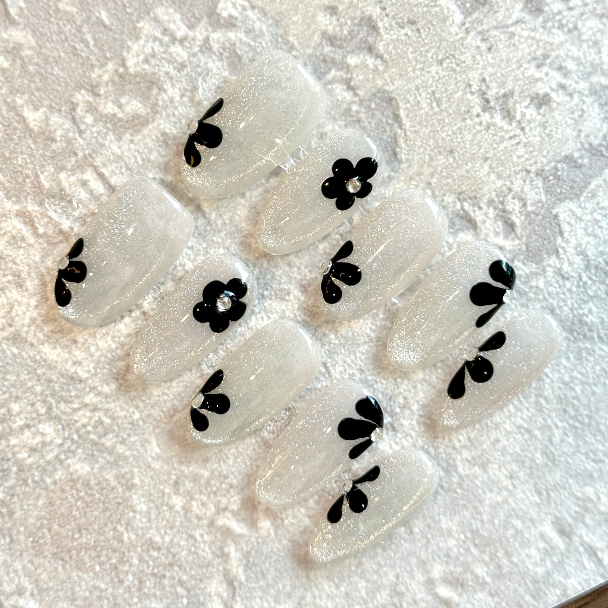 Bring playful elegance to your fingertips with *Noir Daisy*. This silver glitter press-on nail set is decorated with bold black floral designs, each accented with a tiny crystal center for a hint of sparkle. Perfect for festival press-on nails, unique high-end manicures, and anyone who loves a chic floral twist. Handcrafted for a salon-quality finish and long-lasting wear.
