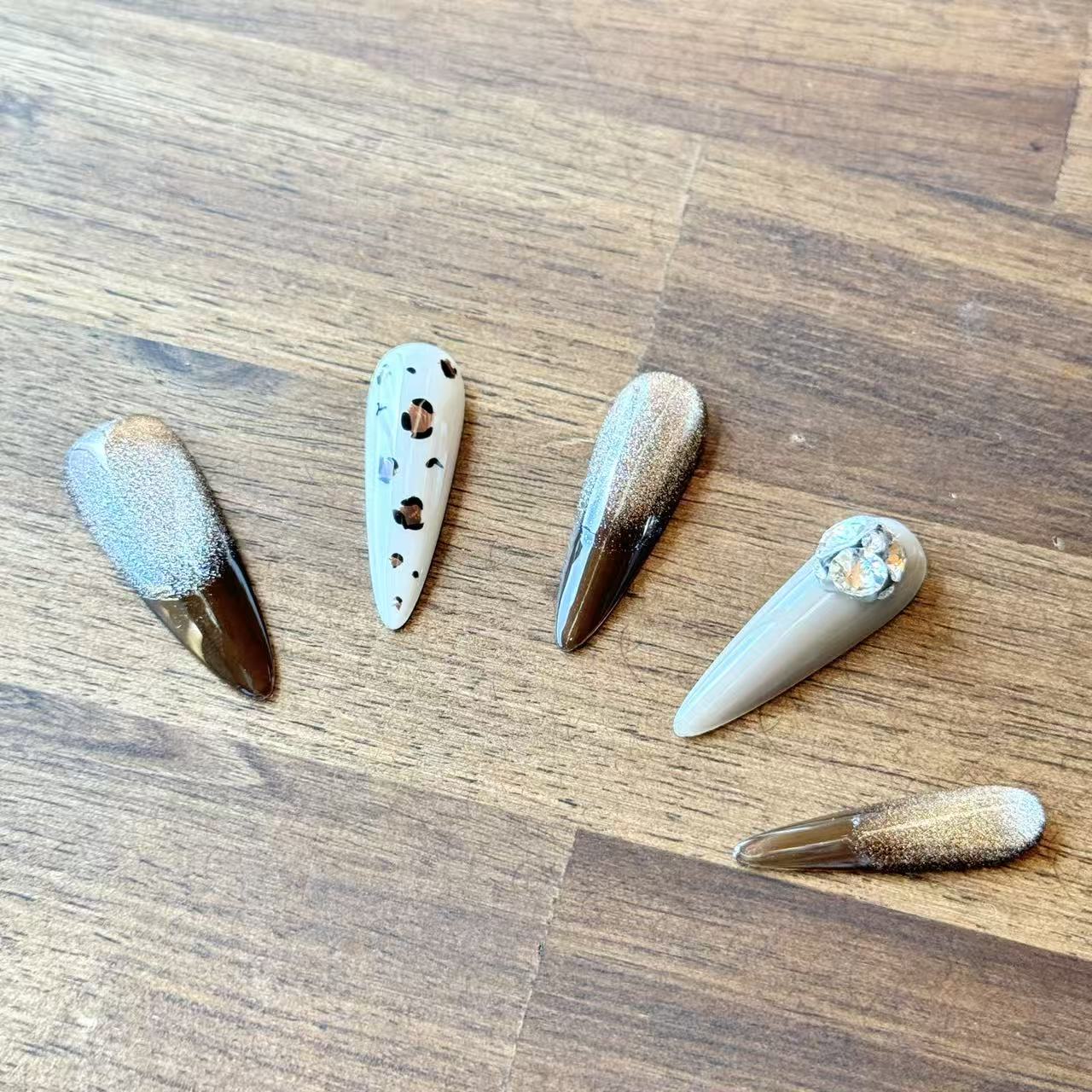 This fierce **stiletto press-on nail set** combines bold **leopard print nails**, dazzling **glitter ombre nails**, and chic **nude beige nails** topped with oversized **crystal accents**. The deep coffee-brown base adds sophistication, while the sparkle and animal print bring instant wild energy.